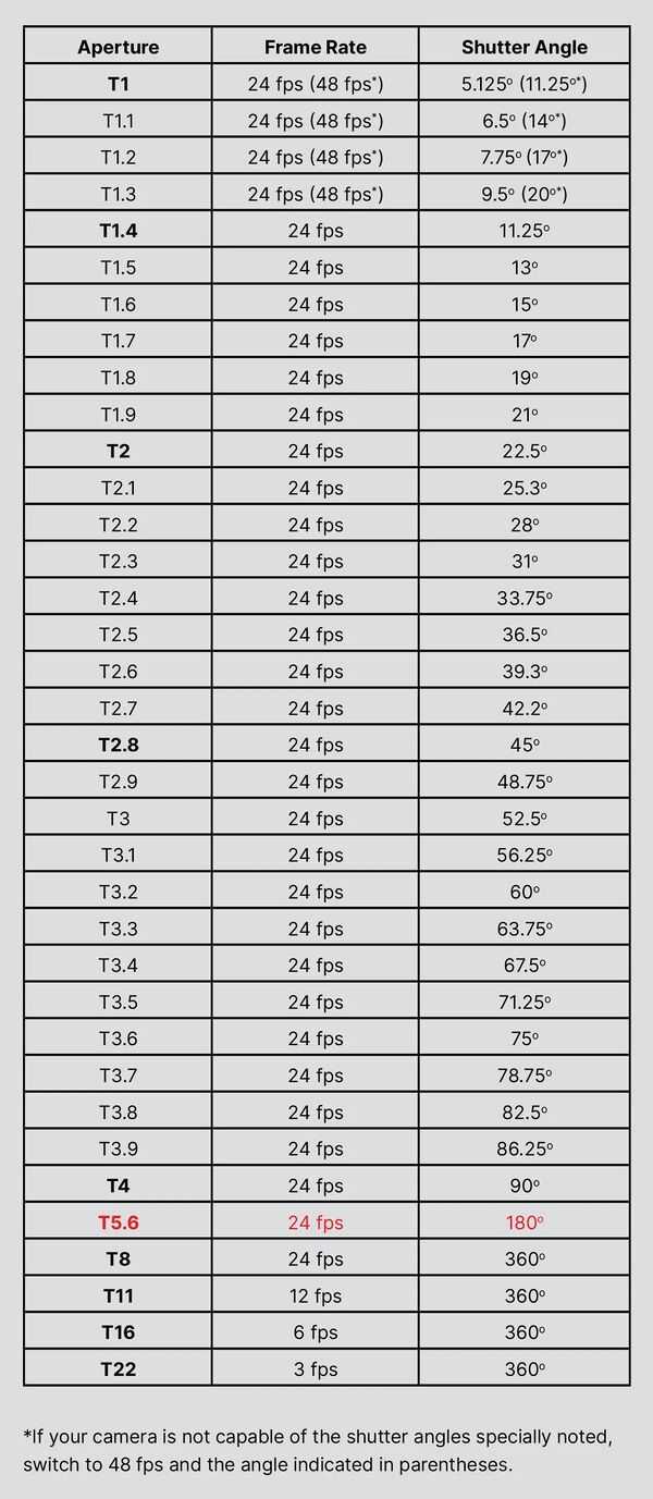 This chart is provided as a guideline for exposure compensation via shutter angle and frame rate, with a base starting at T5.6, with a 180-degree shutter at 24 fps (noted in red). This base is chosen so that you may reach all of the common stops on most lenses without altering lighting. Bolded apertures are full common stops; non-bolded are fractional stops, allowing for lenses whose maximum speed is a fractional stop (i.e., T1.3 or T1.9 as opposed to T1.4 or T2). When testing on some cameras, not all of these shutter angles or frame rates may be possible. In those circumstances, you may need to compensate exposure via lighting.