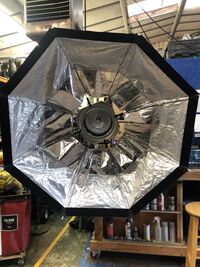 The Octa-Bank Chimera is a softbox that is an octagon shape. The face of the chimera is 5ft in diameter, if you use the 7’ extension you can make the face 2’ larger. The 5’ comes with an internal full white baffle as well as a full chimera white diffusion face. If you are using the 7’ Octabank, you can use the 5’ face as a baffle. When used as a 5' bank, its capacity is 1200 watts. When used as a 7 ft bank, 2000 watts is the limit.